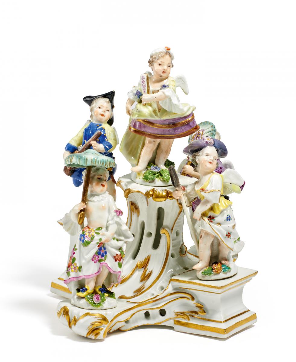 Beschreibung: Amorette als Schäferin, Amorette als Reifrockdame, Amorette als Jäger, Amorette als Dame
