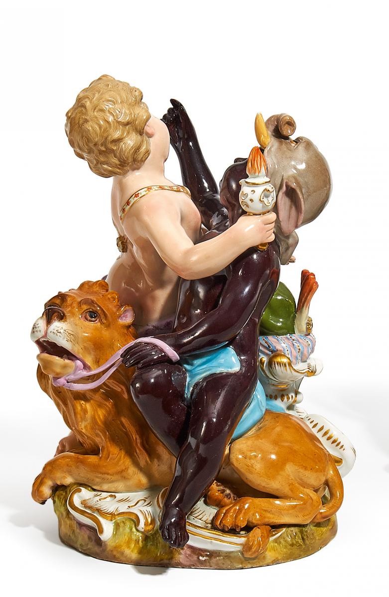 Porzellan, farbig und gold staffiert. Auf einem Löwen sitzender Mohr mit Elefantenhaube einen Knaben mit orientalischem Schmuck