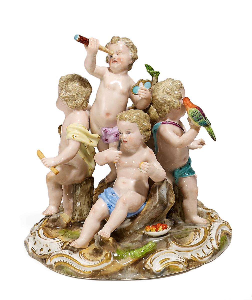 Porzellan, farbig und gold staffiert. Auf Erdsockel mit Rocaillen fünf Putten die Sinne Sehen, Hören, Schmecken, Fühlen und