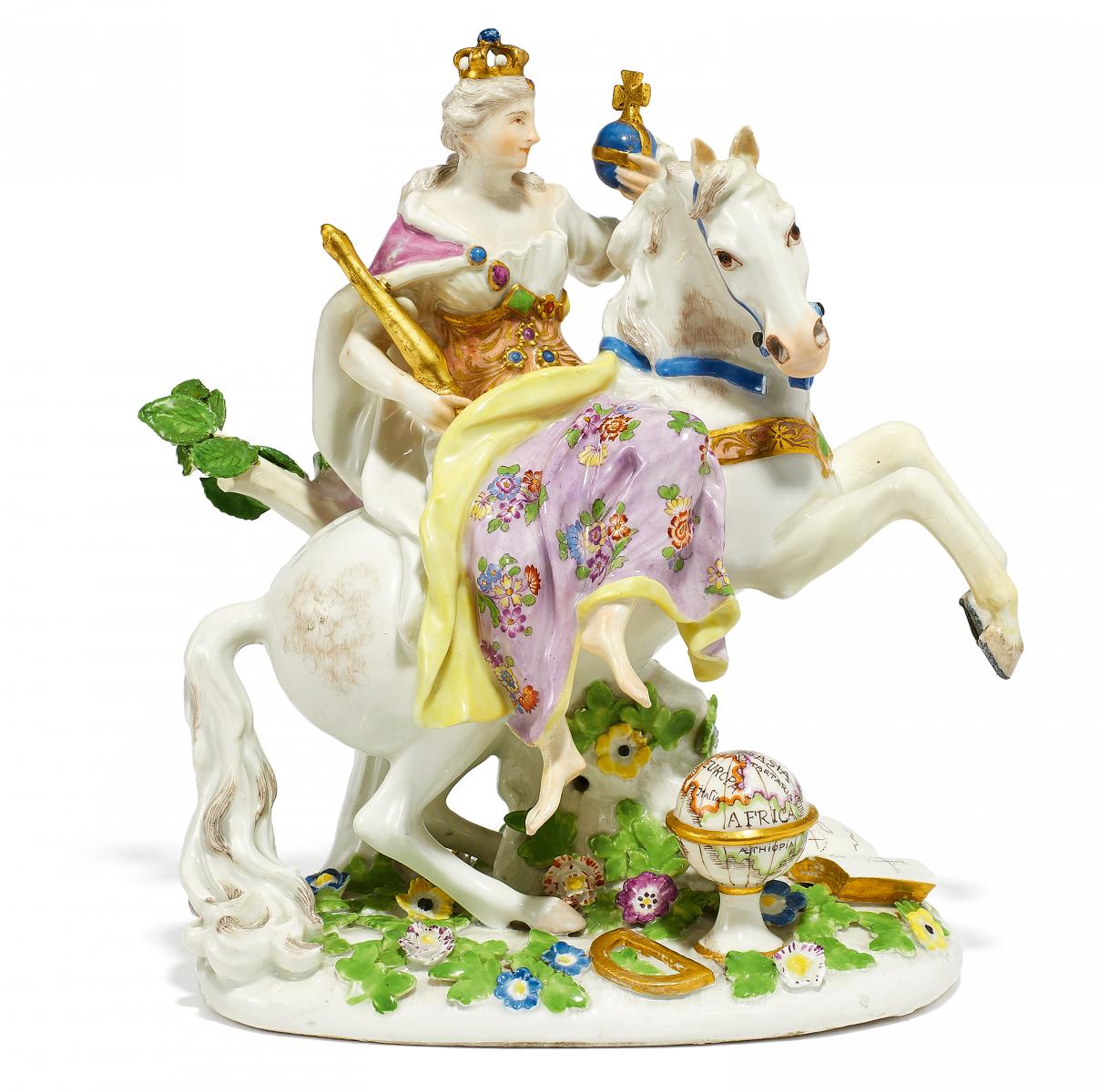 Porzellan, farbig und gold staffiert. Im Damensitz auf dem ansteigenden Pferd sitzend mit Zepter, Reichsapfel und Krone