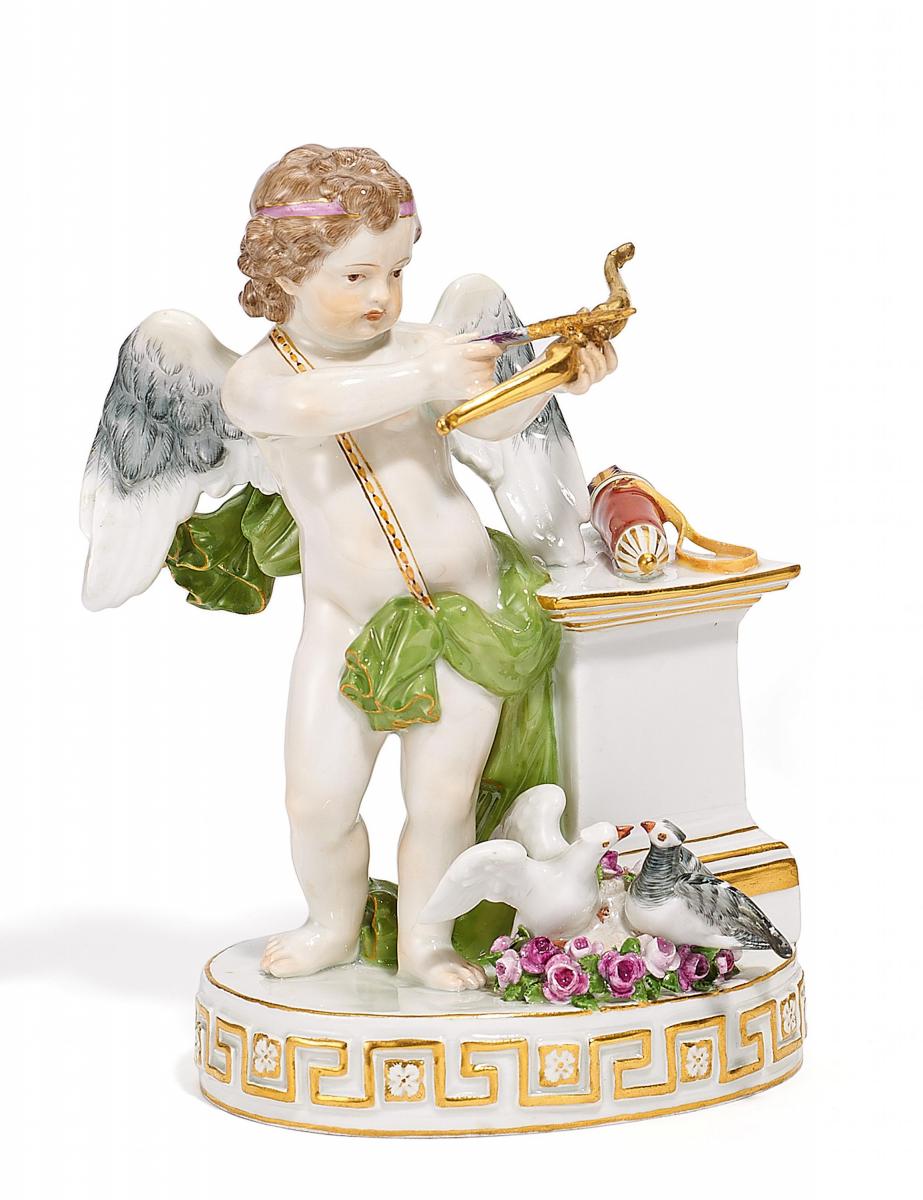 Porzellan, farbig und gold staffiert. Auf ovalem Sockel stehender Amor mit seinem Pfeil zielend. Neben ihm auf einem Postament