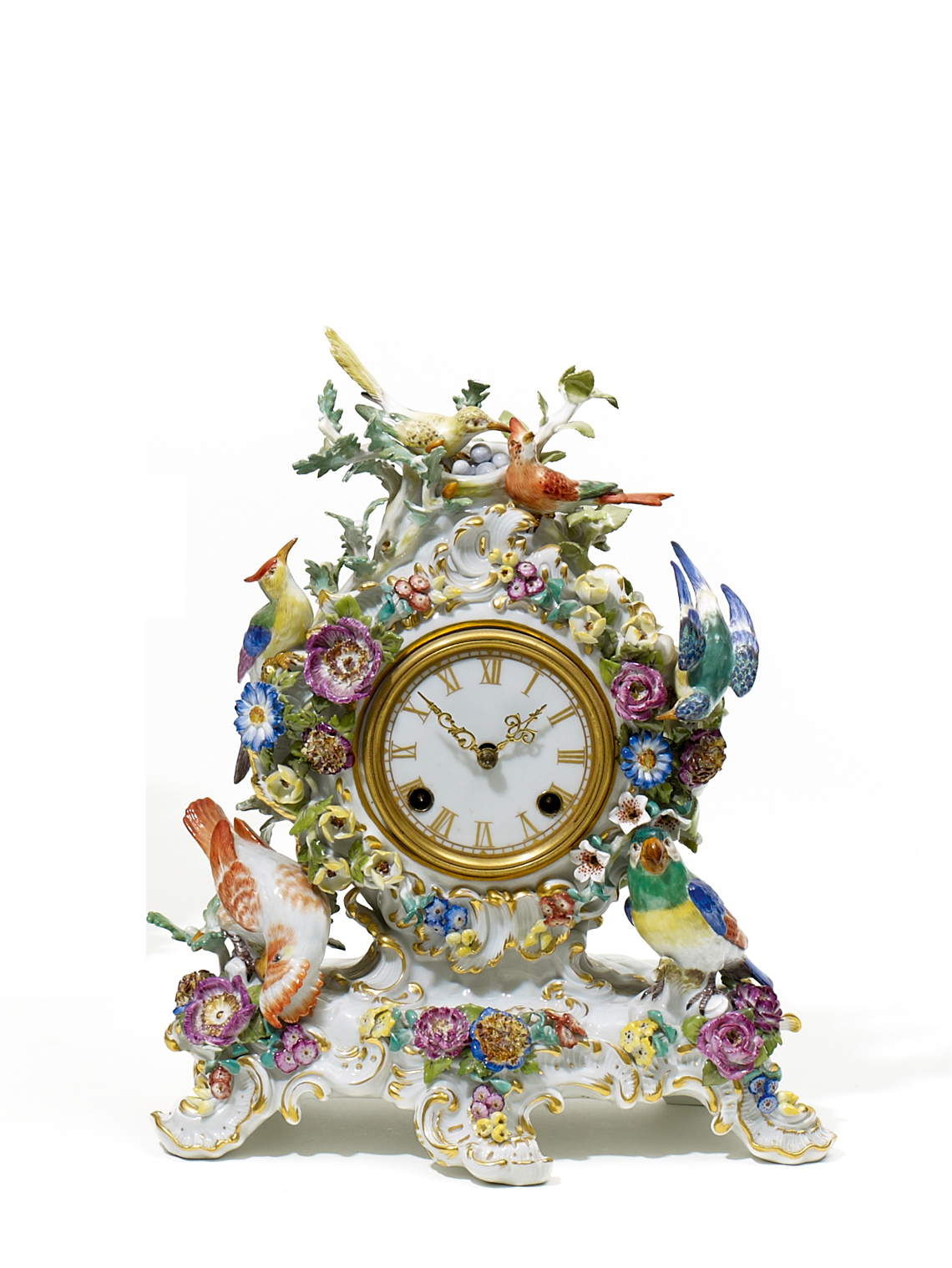 Porzellan, farbig und gold staffiert. Rechteckiger Sockel auf Rocaillefüßen. Rundbogiges Gehäuse mit reicher Blütenauflage. Auf