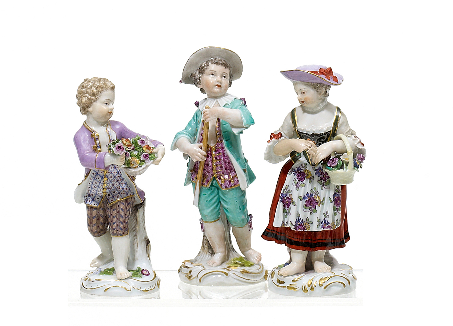 Porzellan, farbig und gold staffiert. Höhe 13cm/13,5cm/14 cm.