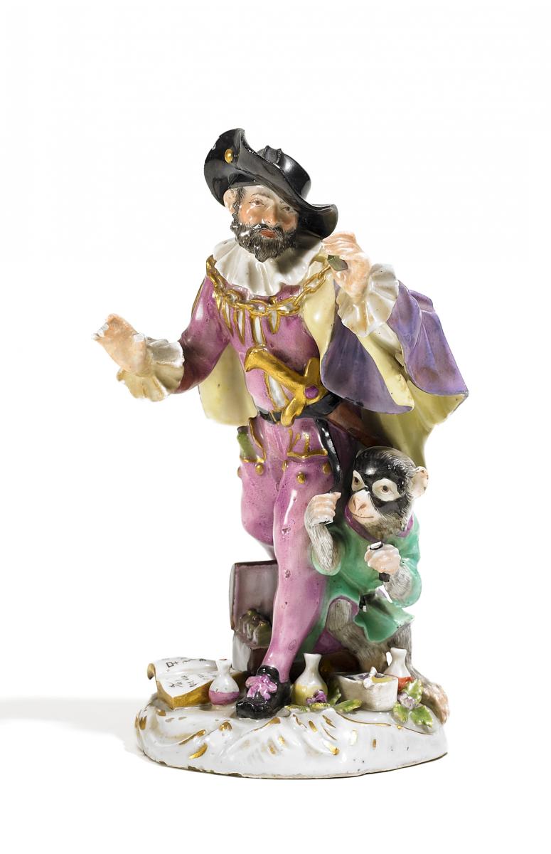 Porzellan, farbig und gold staffiert. Auf Rocaillesockel in auffallendem Kostüm und tänzerischer Haltung stehend mit einem Affen