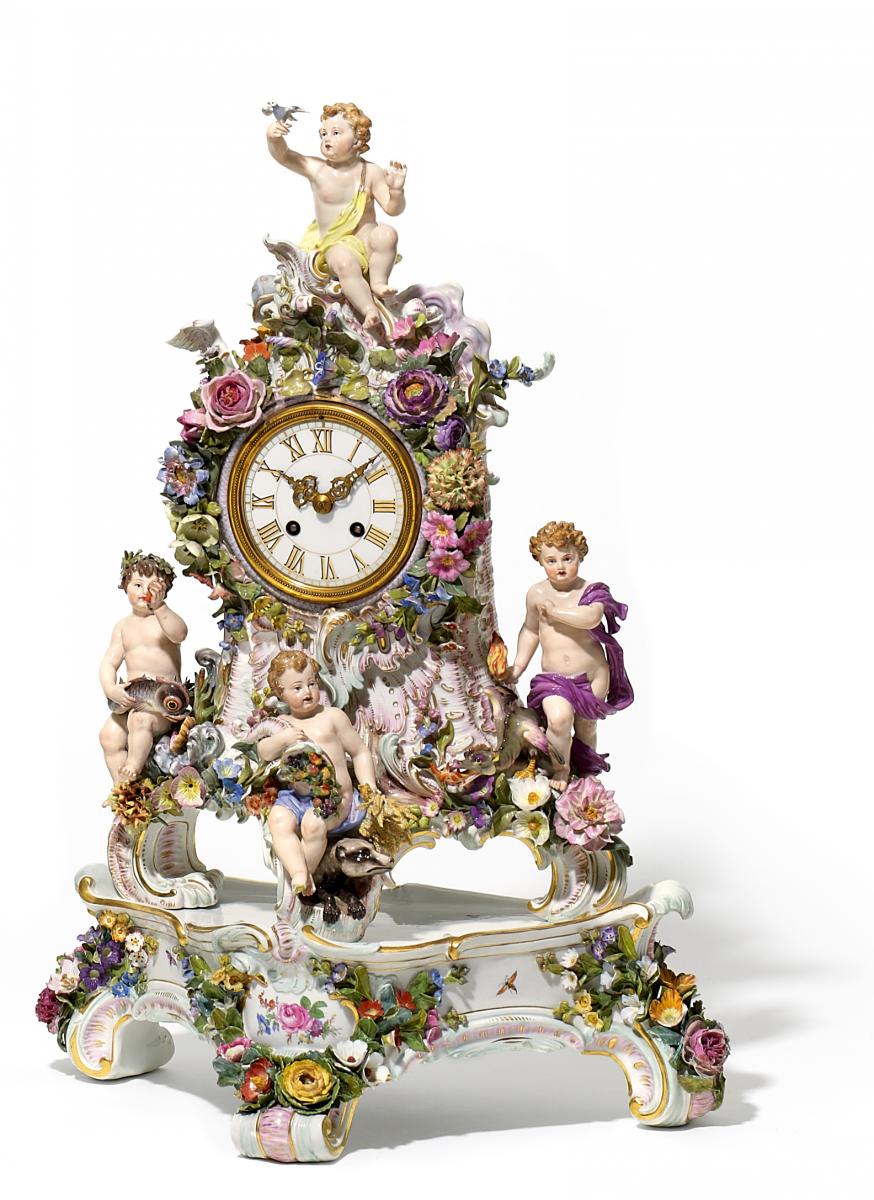 und Erde sitzen. Stark bewegtes Rocaillerelief mit Blütenauflage. Als Bekrönung die Luft. Höhe mit Sockel 58,5 cm.