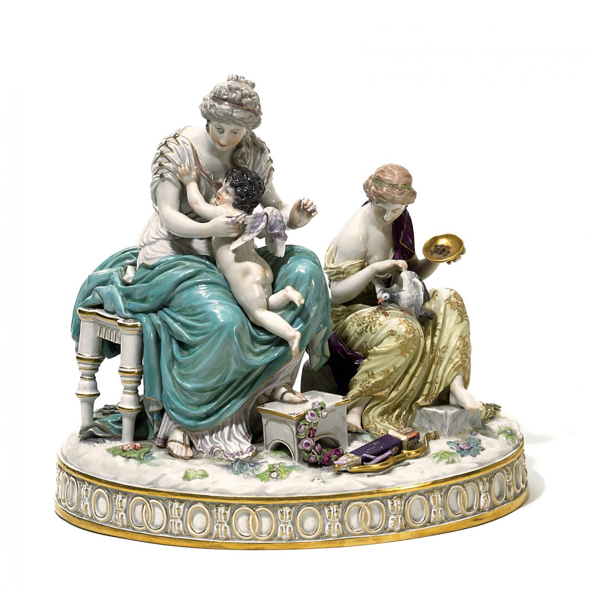 Porzellan, farbig und gold staffiert. Auf ovalem Sockel mit Zierfries auf einem Hocker sitzend Venus, Amor auf ihrem Schoß die