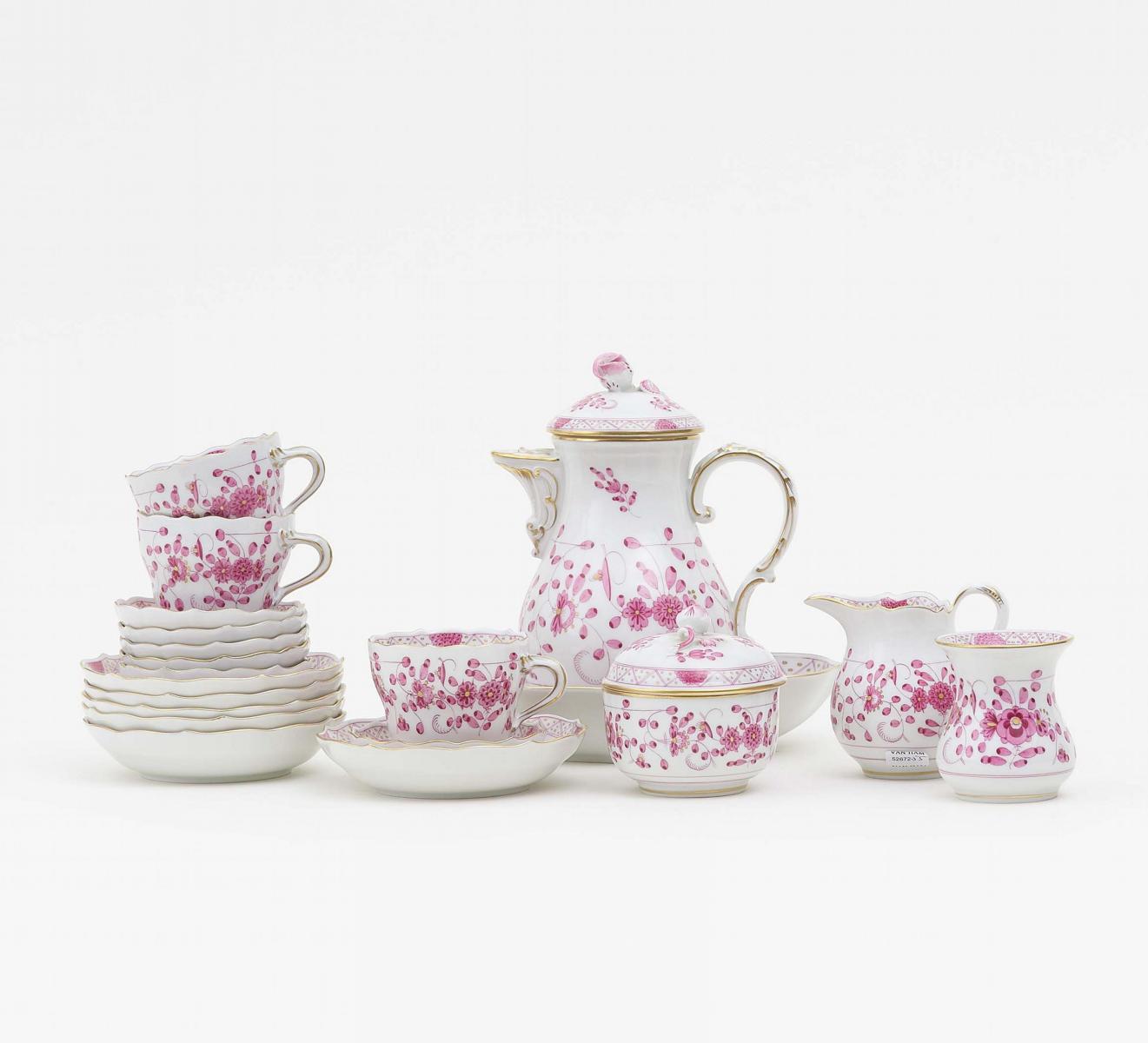 Porzellan, purpur und gold staffiert. Insg. 23 Teile, best. aus Kaffeekanne, Milchkännchen, Zuckerdose, Tablett, Vase, 6