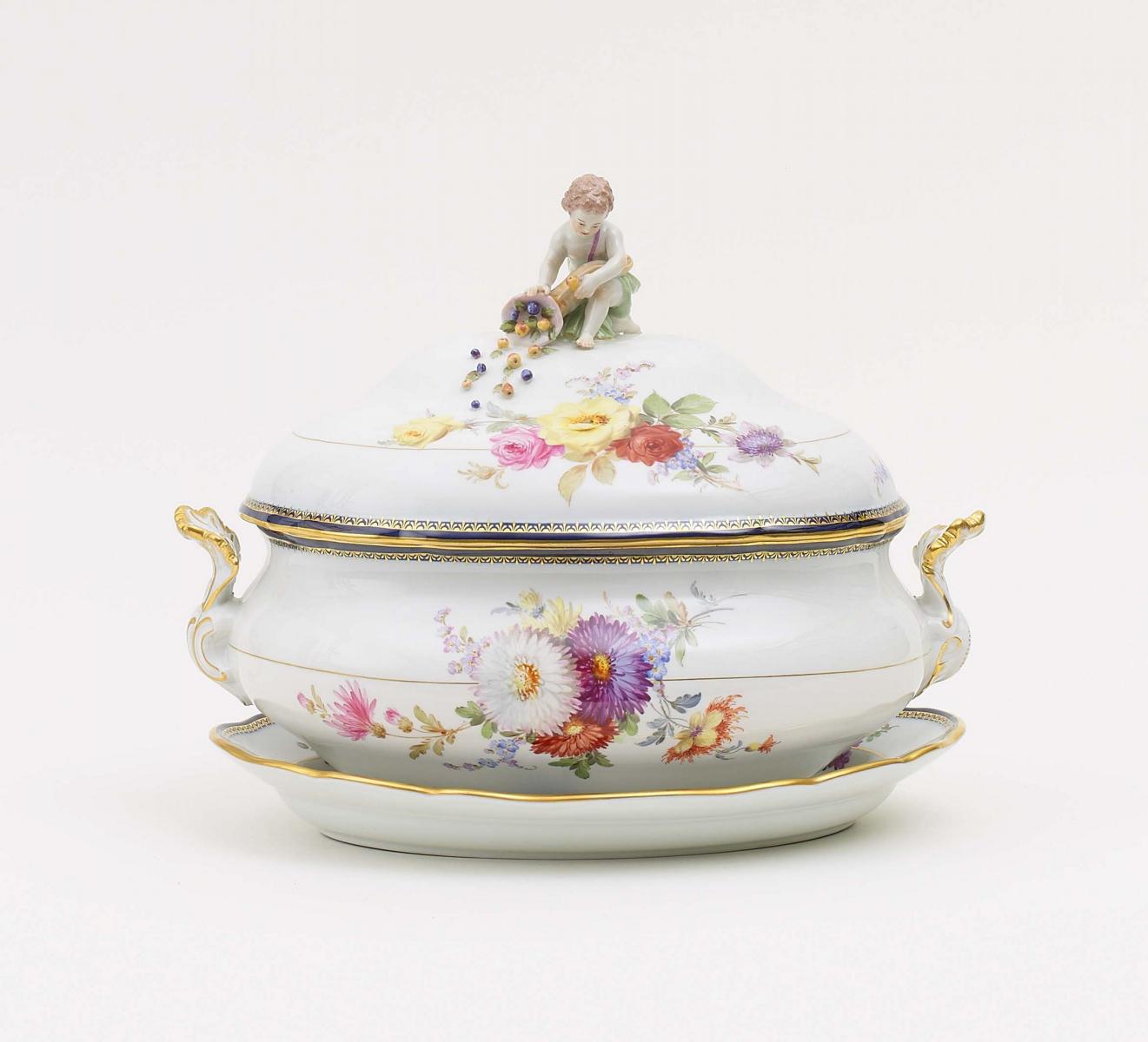 Porzellan, farbig und gold staffiert. H. Terrine 30cm/L. Platte 35 cm.