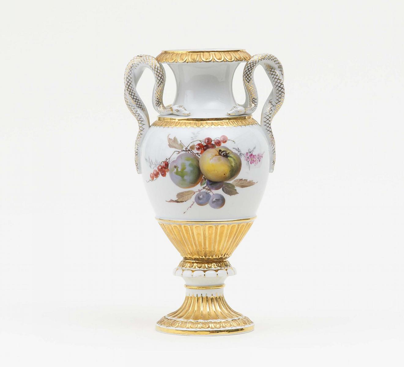 KLEINE SCHLANGENHENKELVASE MIT OBSTDEKOR.