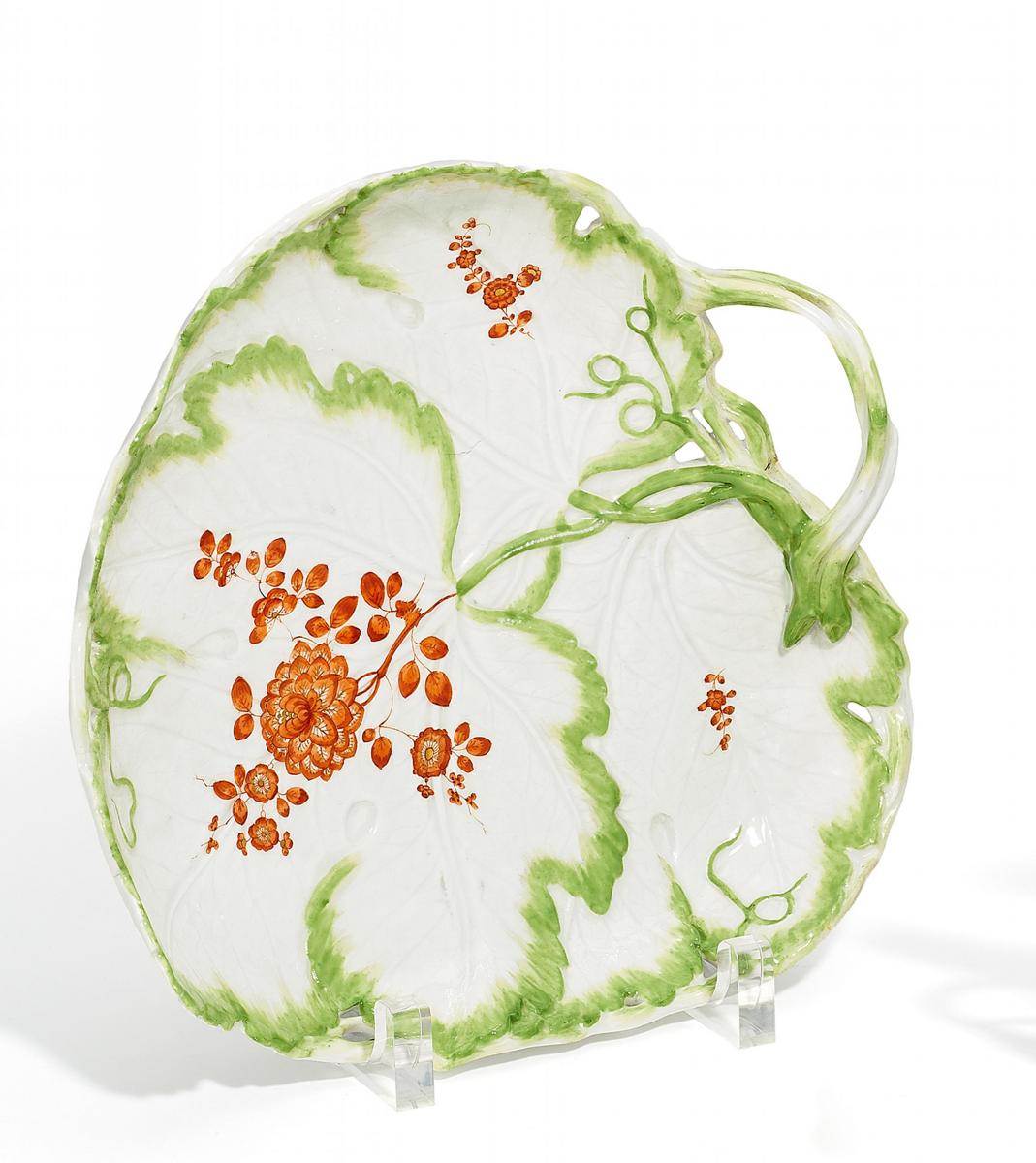 Porzellan, grün, eisenrot und gold staffiert. Anbietschale mit Asthenkel in Form zweier übereinander gelegter Blätter. Im Spiegel