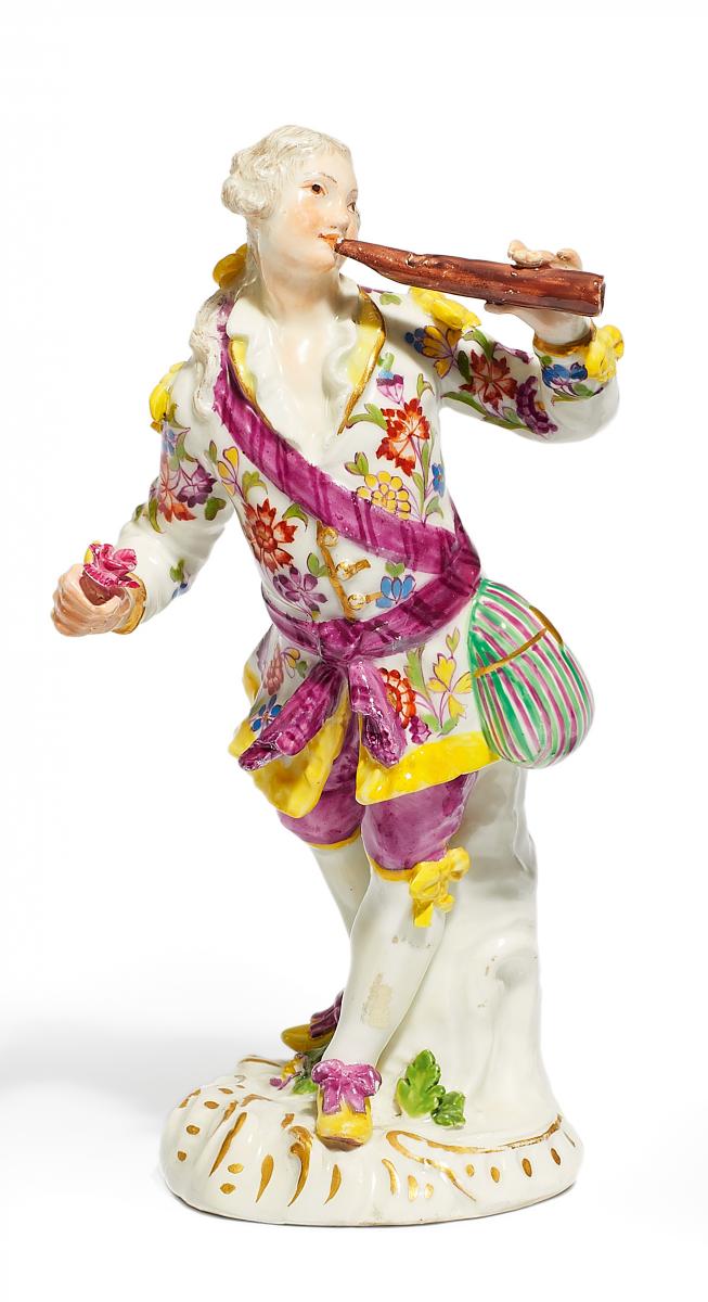 Porzellan, farbig und gold staffiert. Auf rundem Sockel mit Rocaillen stehender Kavalier, in der linken Hand die Flöte haltend