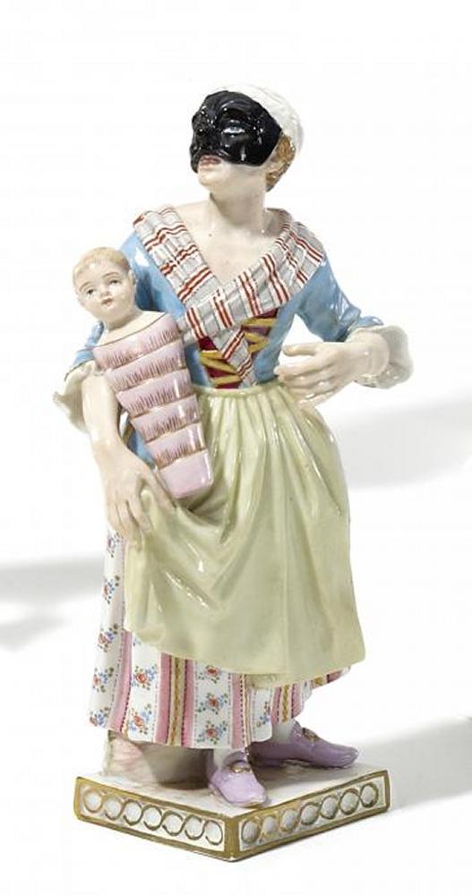 Porzellan, farbig und gold staffiert. Gnaga mit Maske und Wickelkind auf dem Arm. Höhe 17,5 cm.