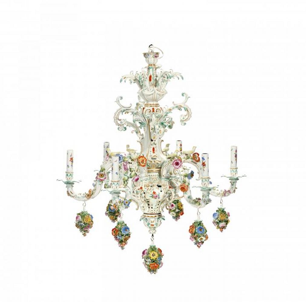 Porzellan, farbig und gold staffiert. Elektrifiziert. Sechsflammiger Kronleuchter mit reicher Rocailleverzierung, Voluten- und Blütendekor. Auf