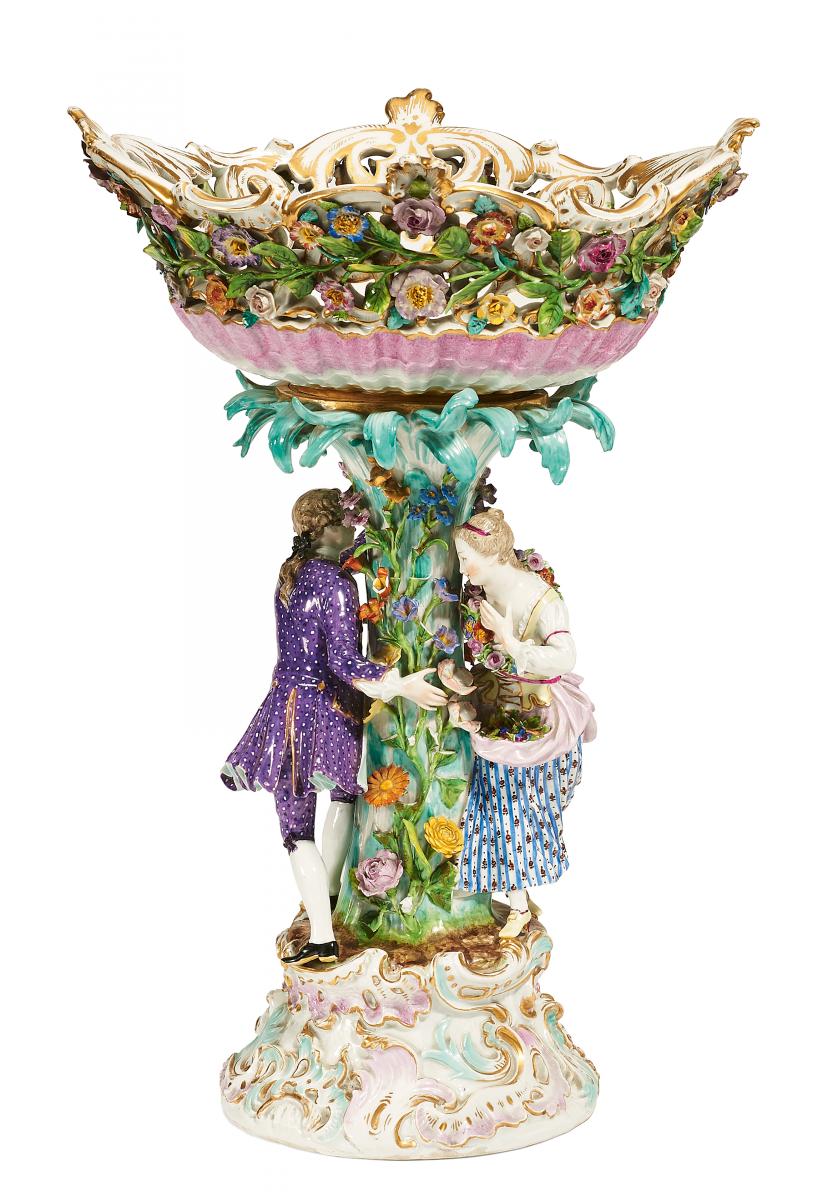 Schaft ein junges Paar laufend. Auf den Palmetten korbartig durchbrochene Schale mit