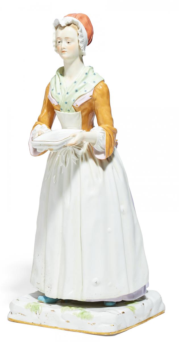 Beschreibung: Auf Erdsockel junge Frau mit weißer Schürze stehend.