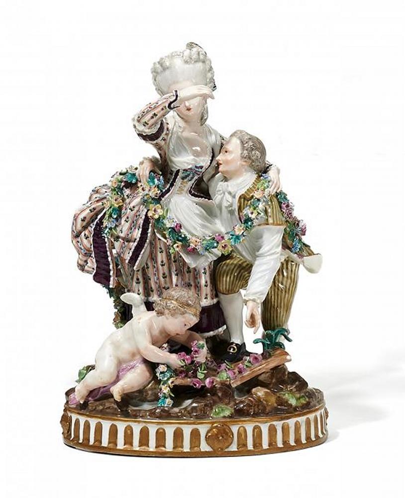 Porzellan, farbig und gold staffiert. Auf ovalem Sockel Kavalier einer Dame über den Steg helfend. Begleitet von zwei Amoretten. Höhe 24,5 cm.
