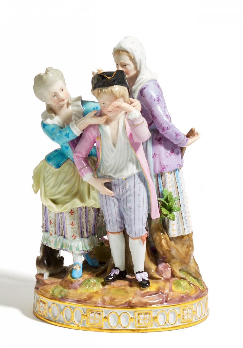 Porzellan, farbig und gold staffiert. Die Schwester ihren Bruder tröstend. Hinter den beiden die, den Jungen rügende Mutter mit