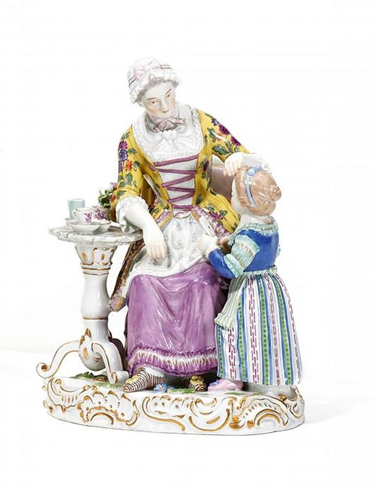 Porzellan, farbig und gold staffiert. An einem mit Kaffee gedeckten Tisch sitzende ältere Dame, daneben ein Kind, einen