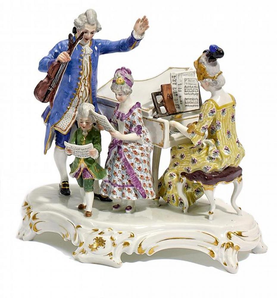 Porzellan, farbig und gold staffiert. Auf Rocaillesockel höfische Dame Klavier spielend. Daneben stehend ein Kavalier mit Geige