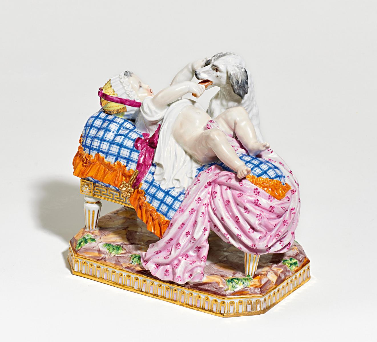 Beschreibung: Auf Bett liegendes Kleinkind über Erdsockel mit Reliefbordüre. Ein Hund ist an der Liege