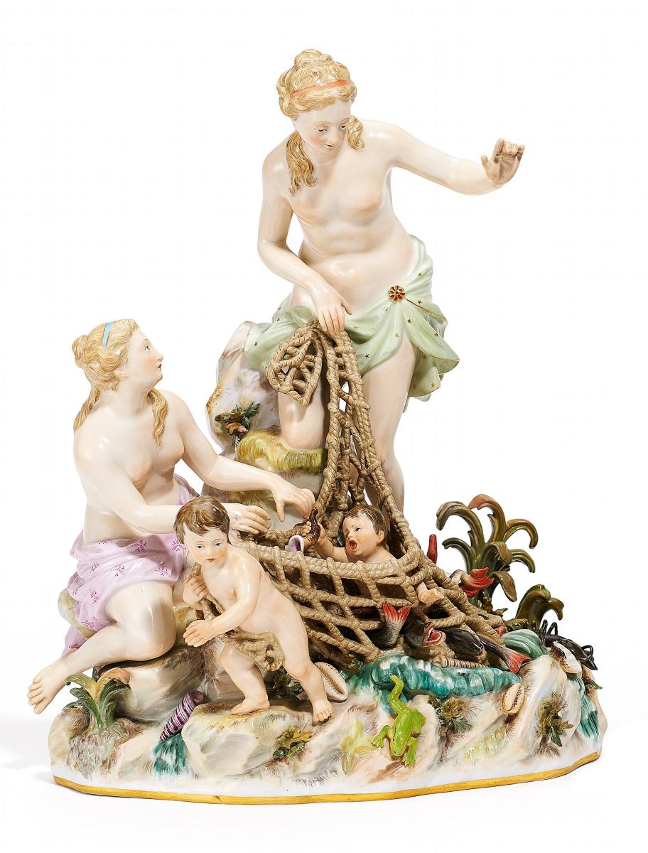 Porzellan, farbig und gold staffiert. Auf ansteigendem Felssockel zwei Wassernymphen und Putto, ein Tritonenkind fangend.