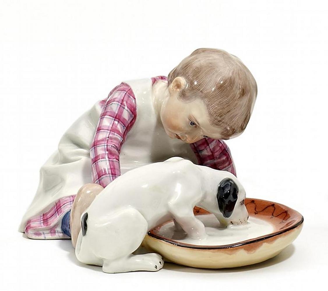Porzellan, farbiges Dekor. Kleiner Junge auf dem Boden sitzend. Vor ihm eine große Schale mit Milch. Daraus ein Hund