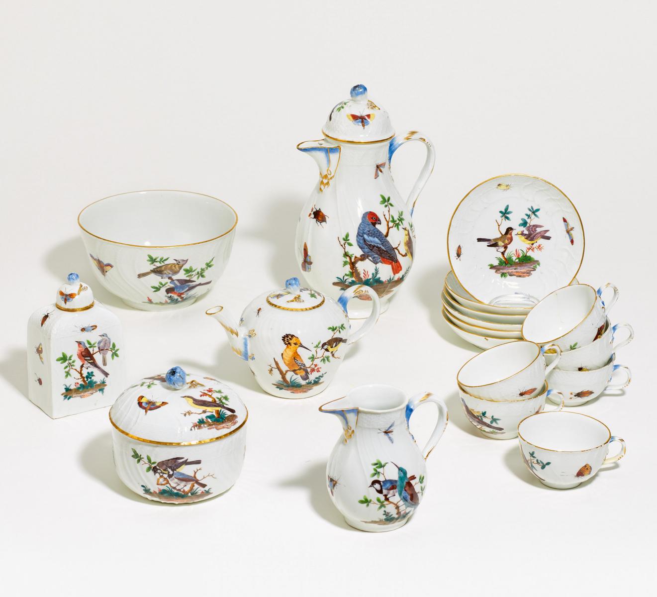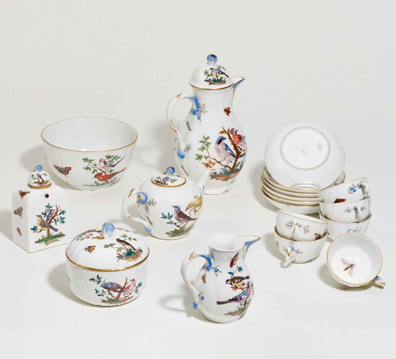 KAFFEE- UND TEESERVICE MIT REICHEM VOGELDEKOR.