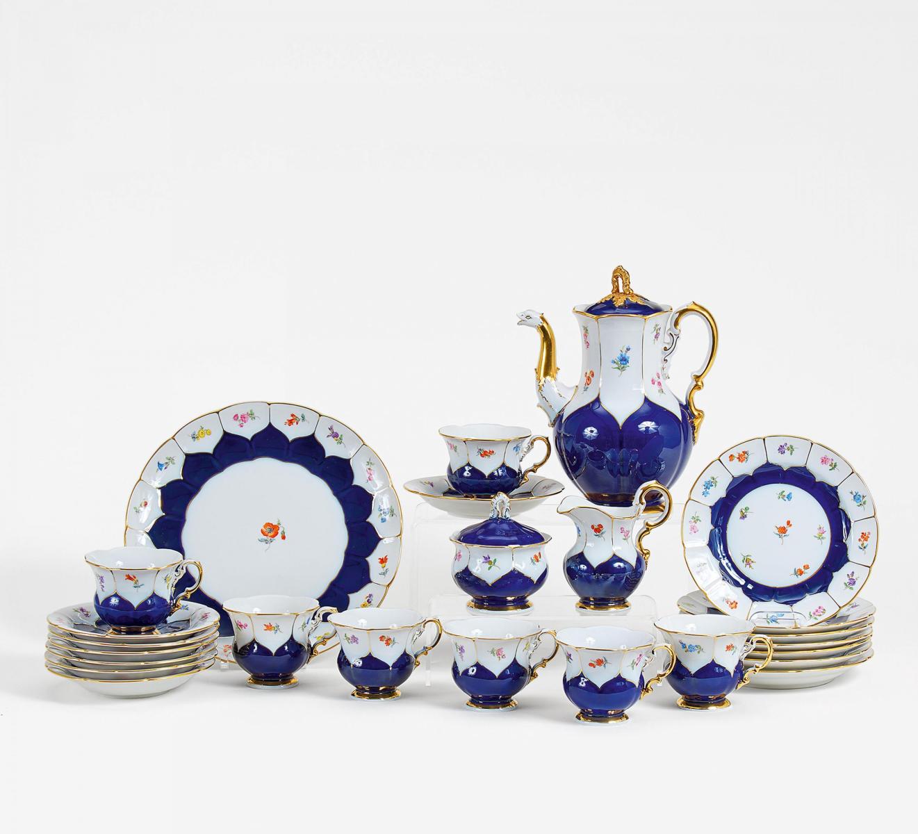KAFFEESERVICE FÜR 7 PERSONEN, "B-FORM," KOBALTBLAU MIT BLÜTEN UND GOLDDEKOR.