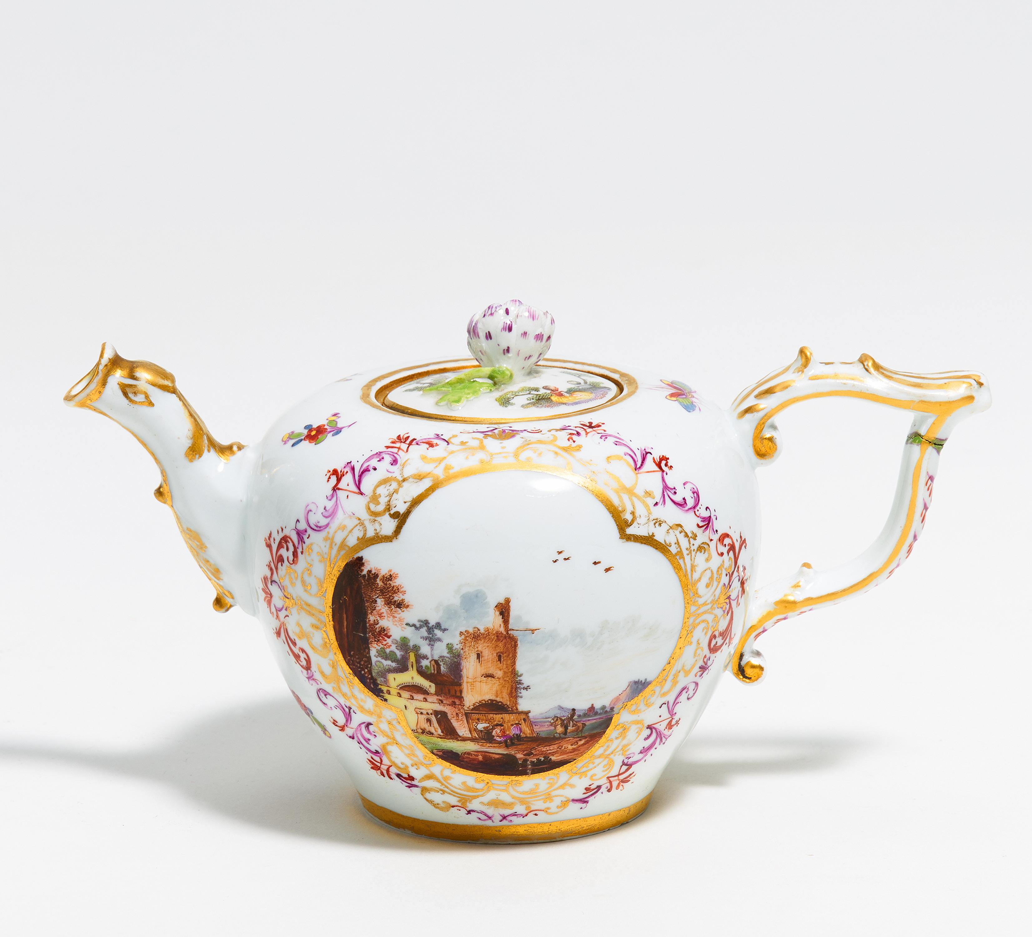KLEINE TEEKANNE MIT LANDSCHAFTSKARTUSCHEN.