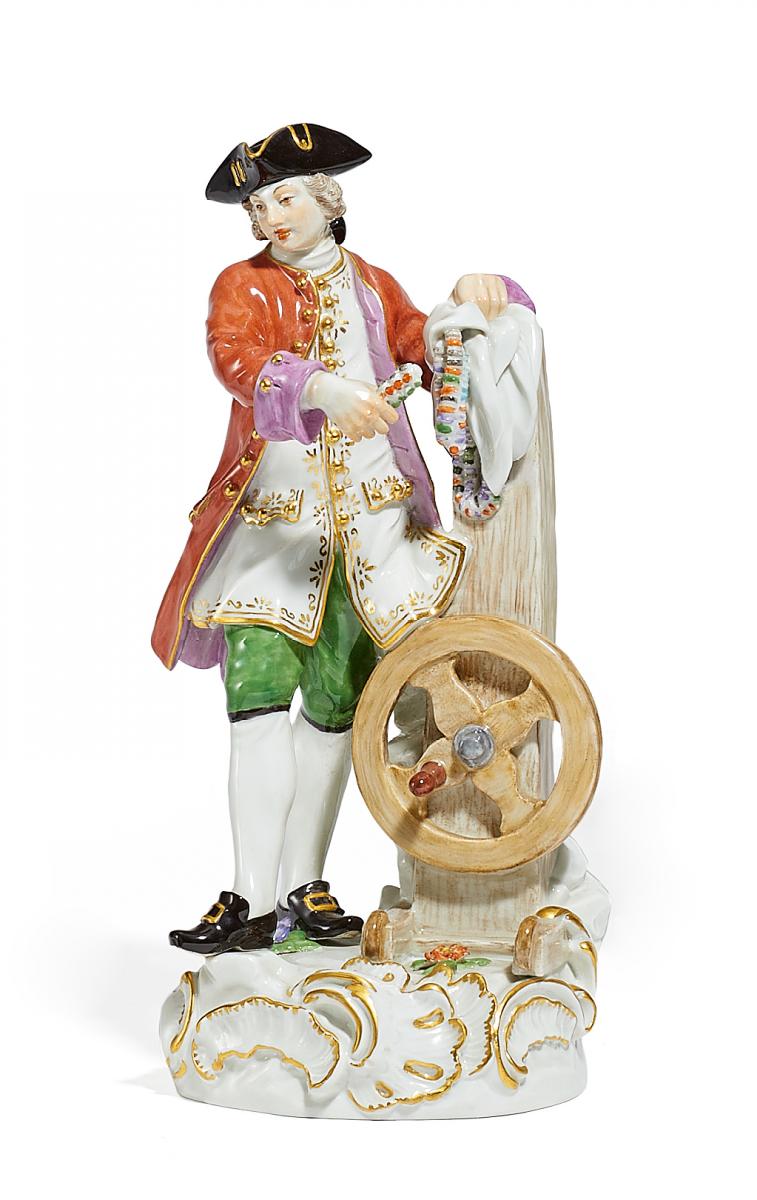Beschreibung: Auf einem Rocaillesockel stehender Knopfmacher mit den Attributen seines Handwerks.