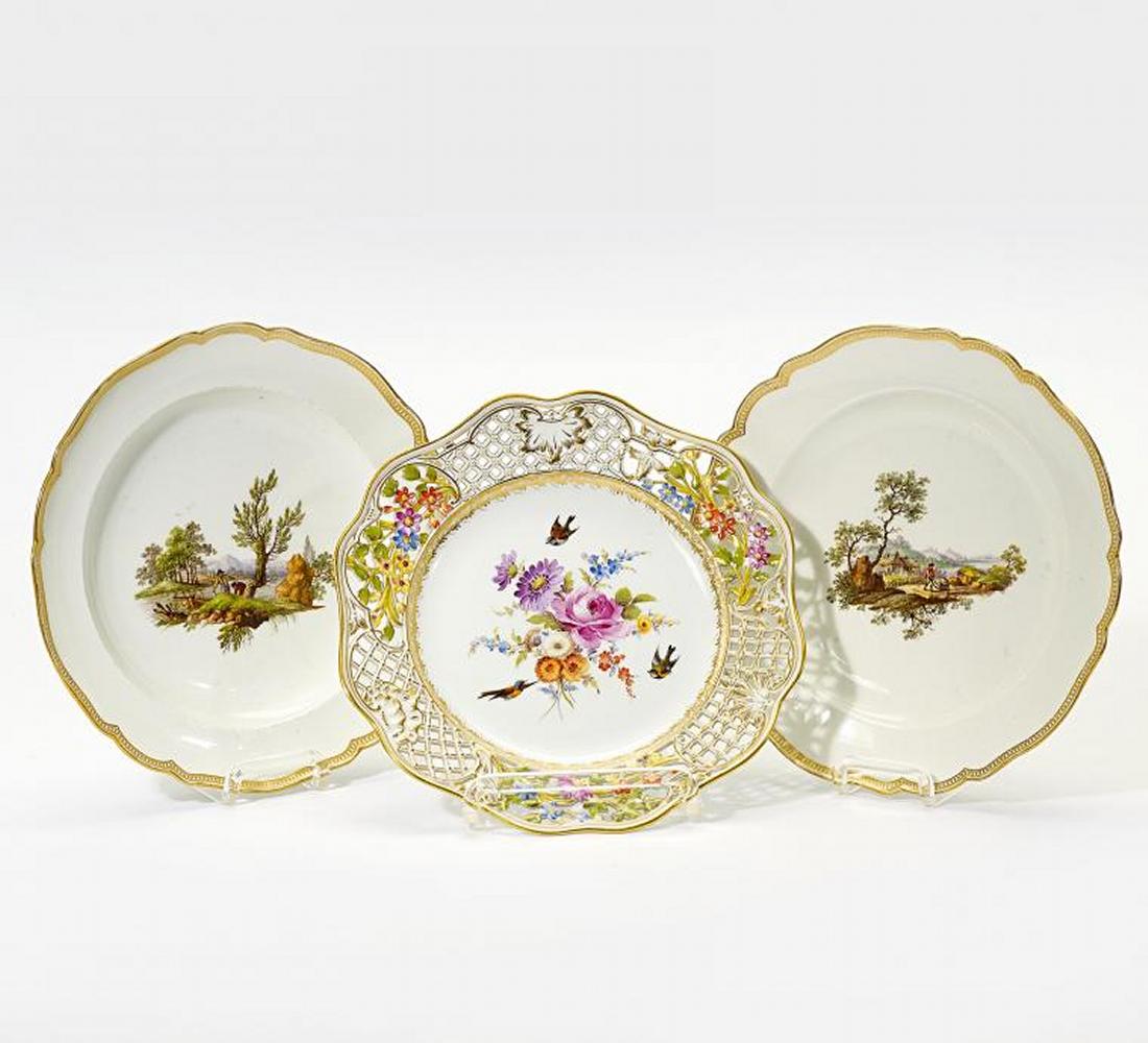 KONVOLUT ZWEI TELLER MIT LANDSCHAFTSSZENEN, EIN TELLER MIT BLUMENDEKOR.