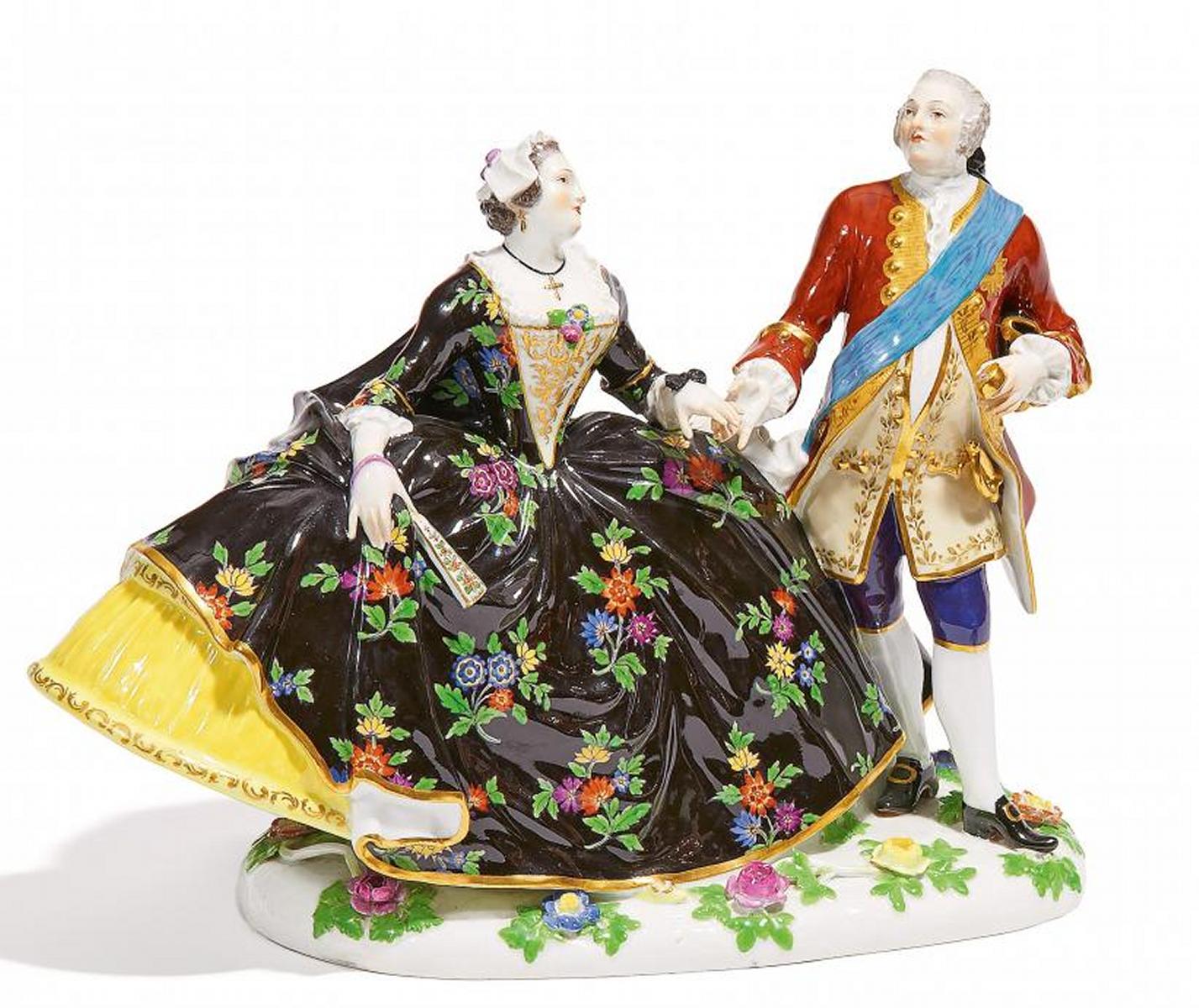 Porzellan, farbig und gold staffiert. Auf ovalem Sockel ein Kavalier mit polnischem Orden und Tabatière eine höfische Dame im