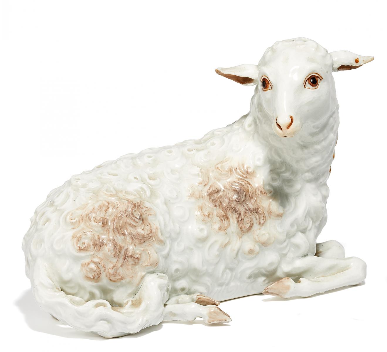 Porzellan, in hellen Brauntönen staffiert. Höhe 12 cm, Länge 17,5 cm.