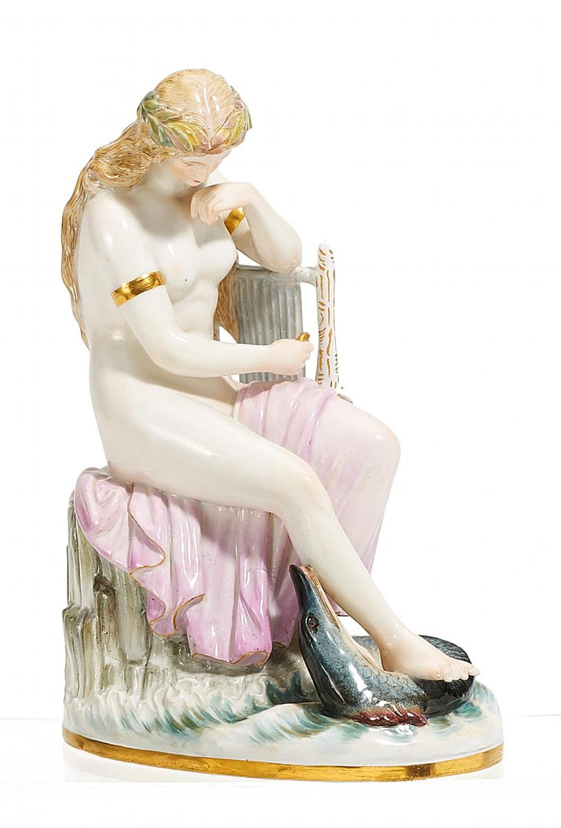 Porzellan, farbig und gold staffiert. Auf einem aus dem Wasser ragenden Felsen sitzende Loreley mit Harfe. Zu ihren Füßen im