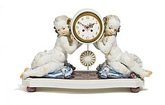 Porzellan, farbig und gold staffiert. Zwei auf Kissen sitzende Putten das Uhrengehäuse haltend. Flacher Sockel mit gedrückten