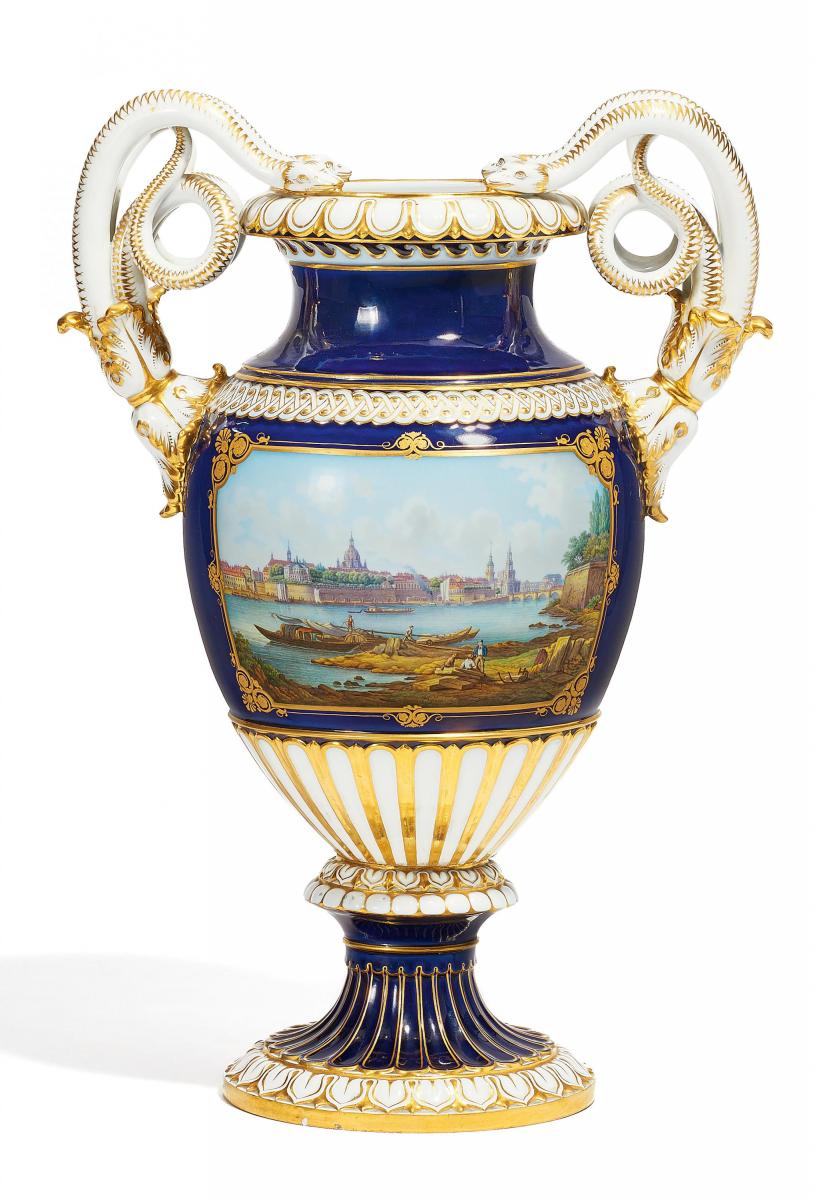 SCHLANGENHENKELVASE MIT VEDUTE VON DRESDEN UND HERRENPORTRÄT.