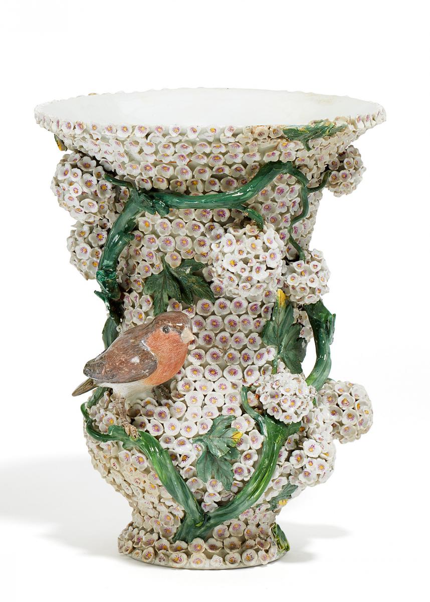 Porzellan, farbig staffiert. Die Wandung dicht besetzt mit weißen Schneeballenblüten und Blütenballen.