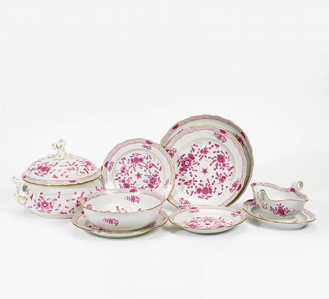 Porzellan, purpur und gold staffiert. 6 Personen. Insg. 25 Teile, best. aus 6 Speisetellern, 6 Suppentellern, 6 Desserttellern,