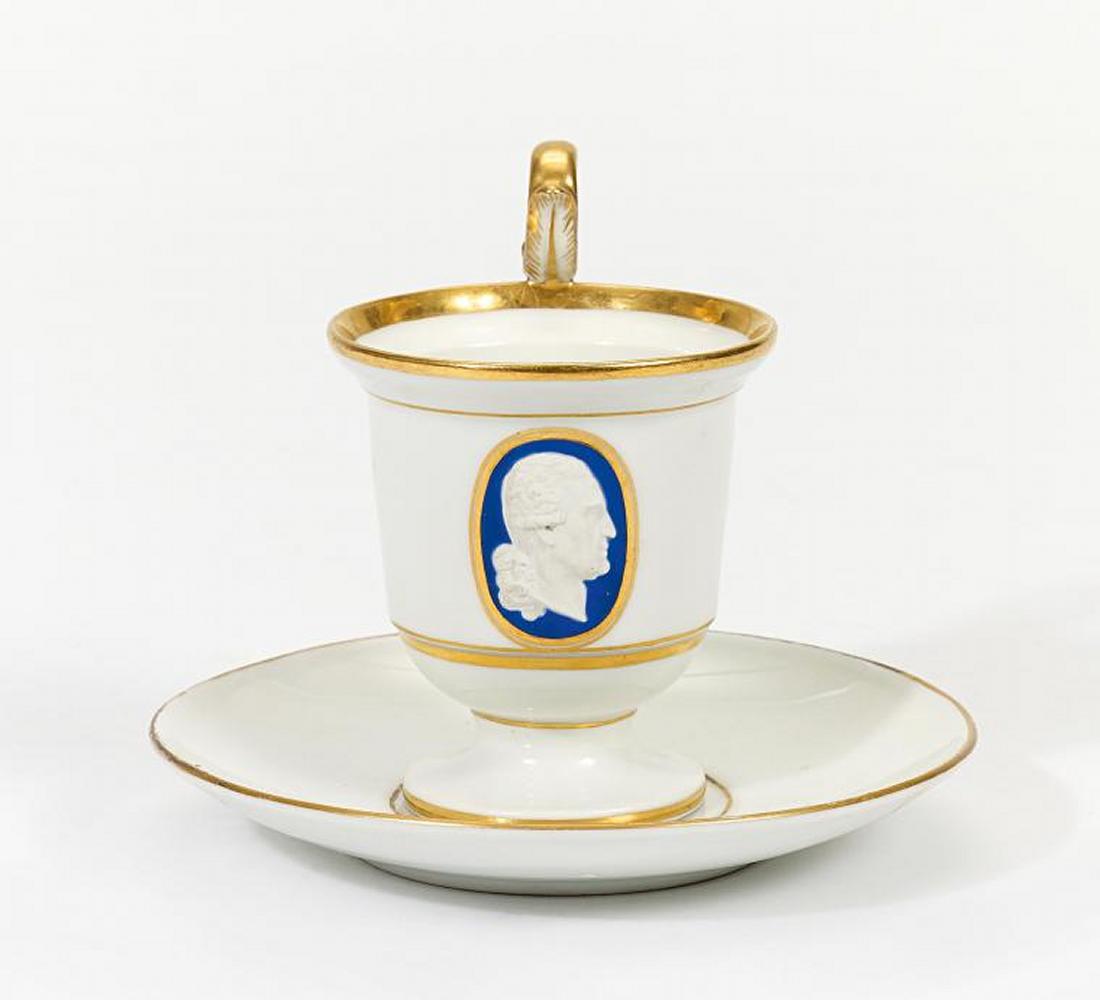 TASSE MIT RELIEFPORTRÄT SCHILLERS UND UNTERTASSE.