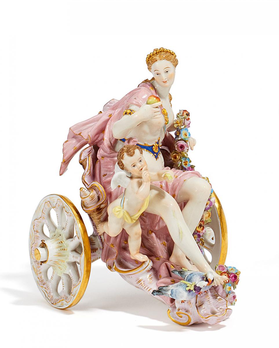 Porzellan, farbig und gold staffiert. Auf einem muschelförmigen Wagen sitzende Venus mit wehendem Gewand. In ihren Händen eine