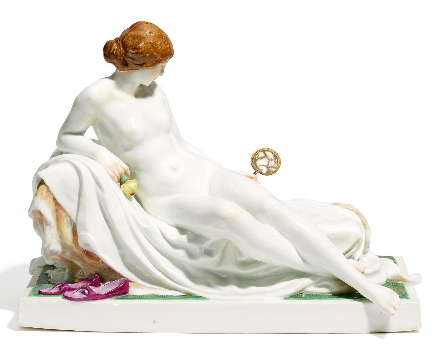 Porzellan, farbig staffiert. Auf rechteckigem Sockel mit Recamier liegender weiblicher Akt sich in einem Handspiegel
