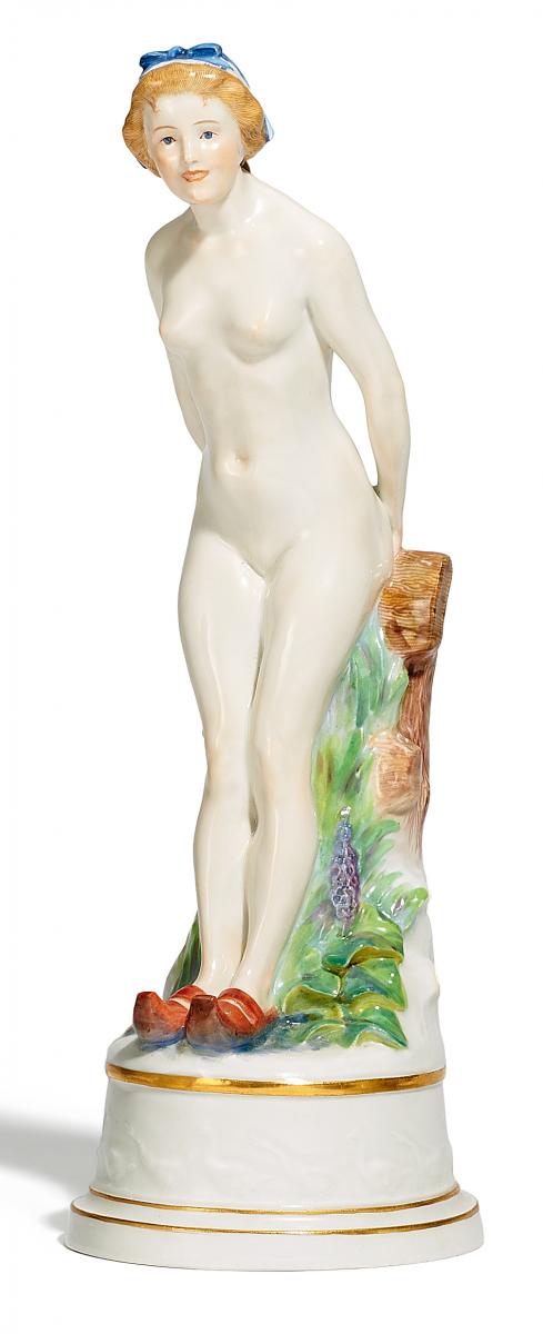 Porzellan, farbig staffiert. Auf ovalem Sockel mit umlaufendem Gänse-Relief nackte Holländerin in Holzschuhen an einen