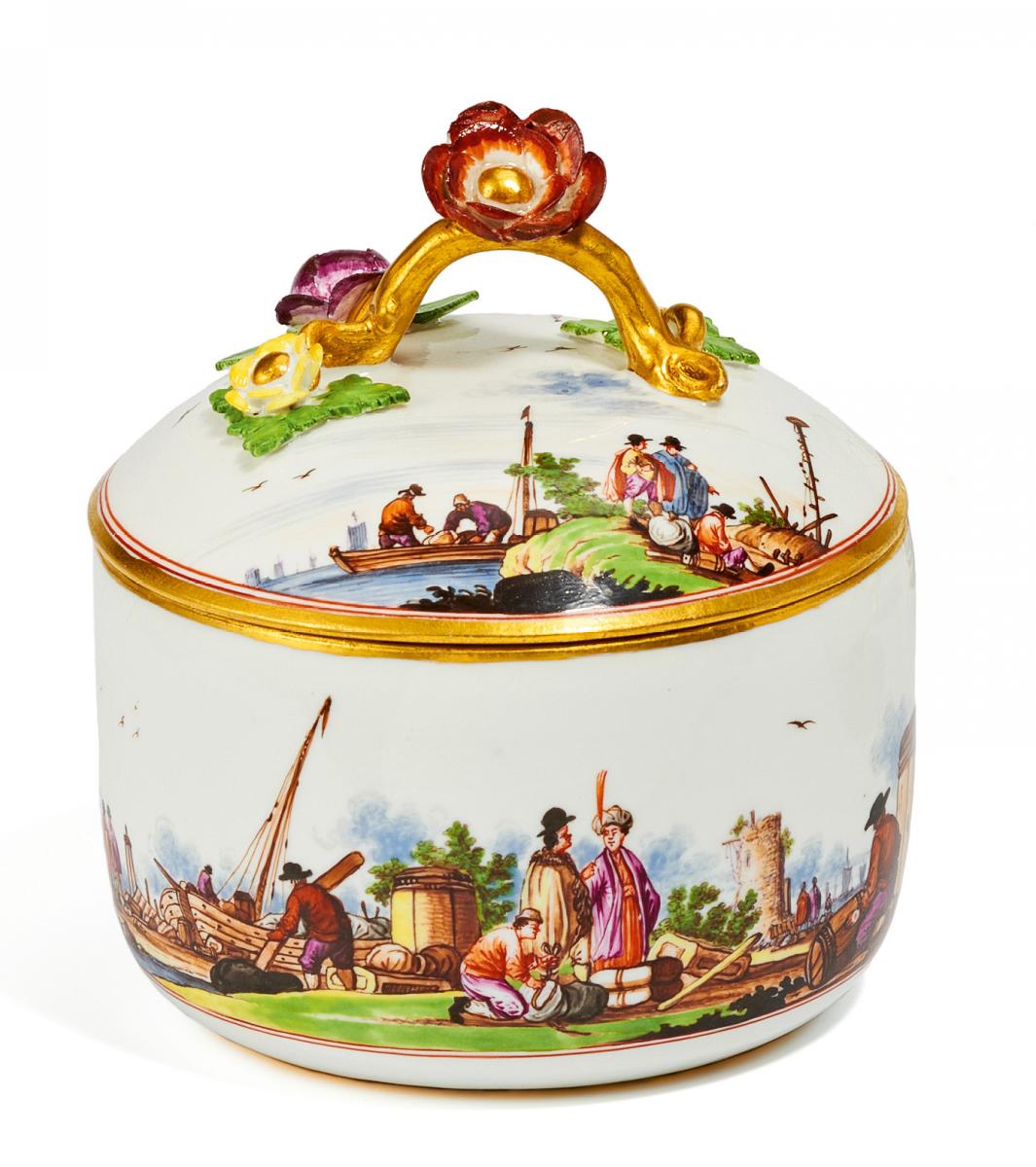 ZUCKERDOSE MIT UMLAUFENDER KAUFFAHRTEISZENE.
