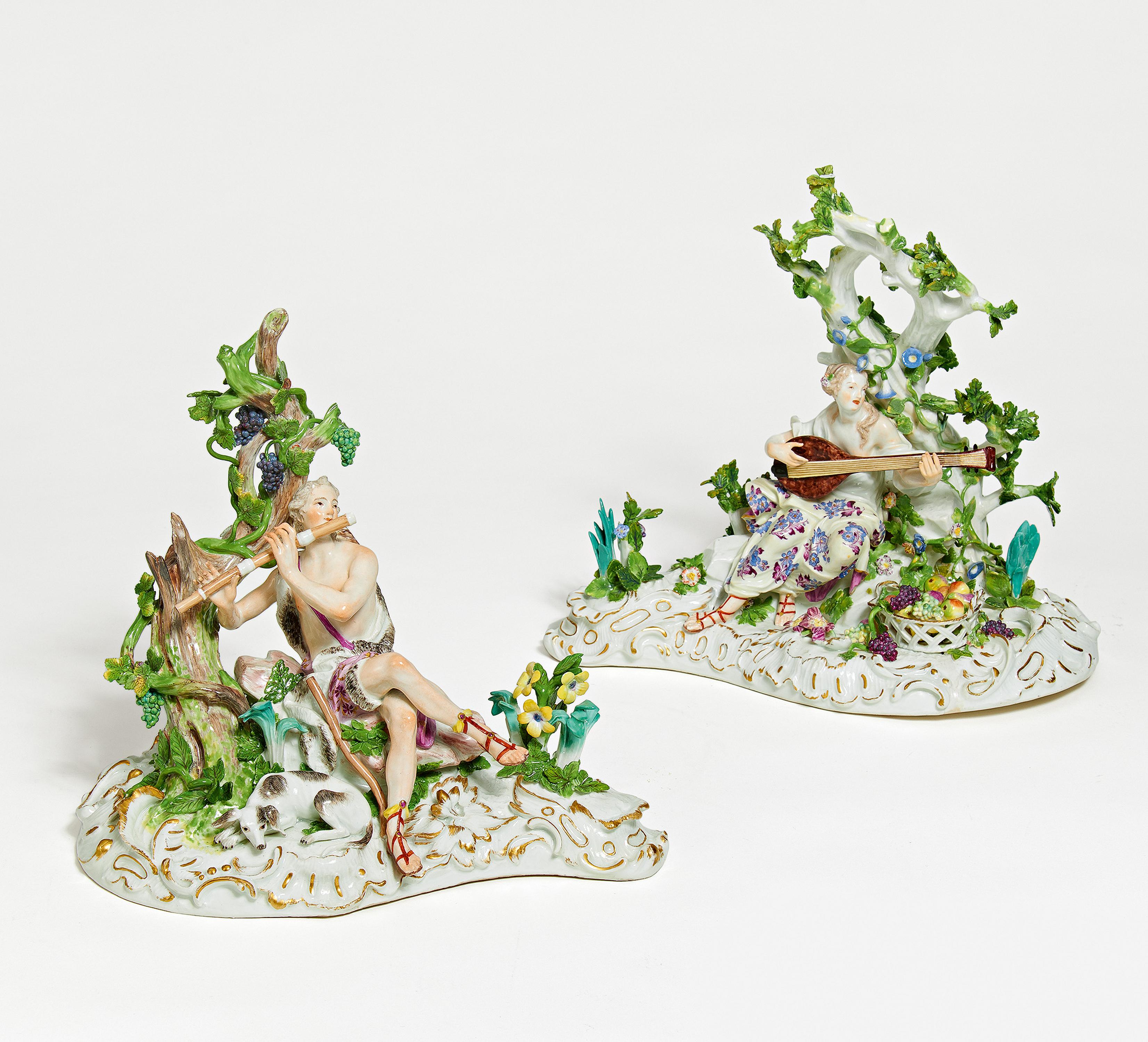 mit Früchten bzw. junger Hirte mit Querflöte und kleinem Hund zu seinen Füßen.