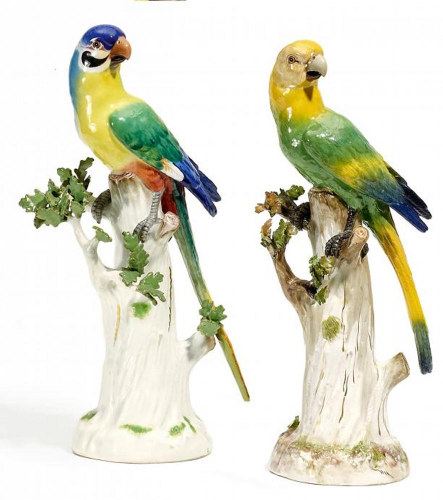 Porzellan, farbig und gold staffiert. Je auf einem Baumstamm sitzender Papagei. Mit den Krallen die Äste umgreifend und nach
