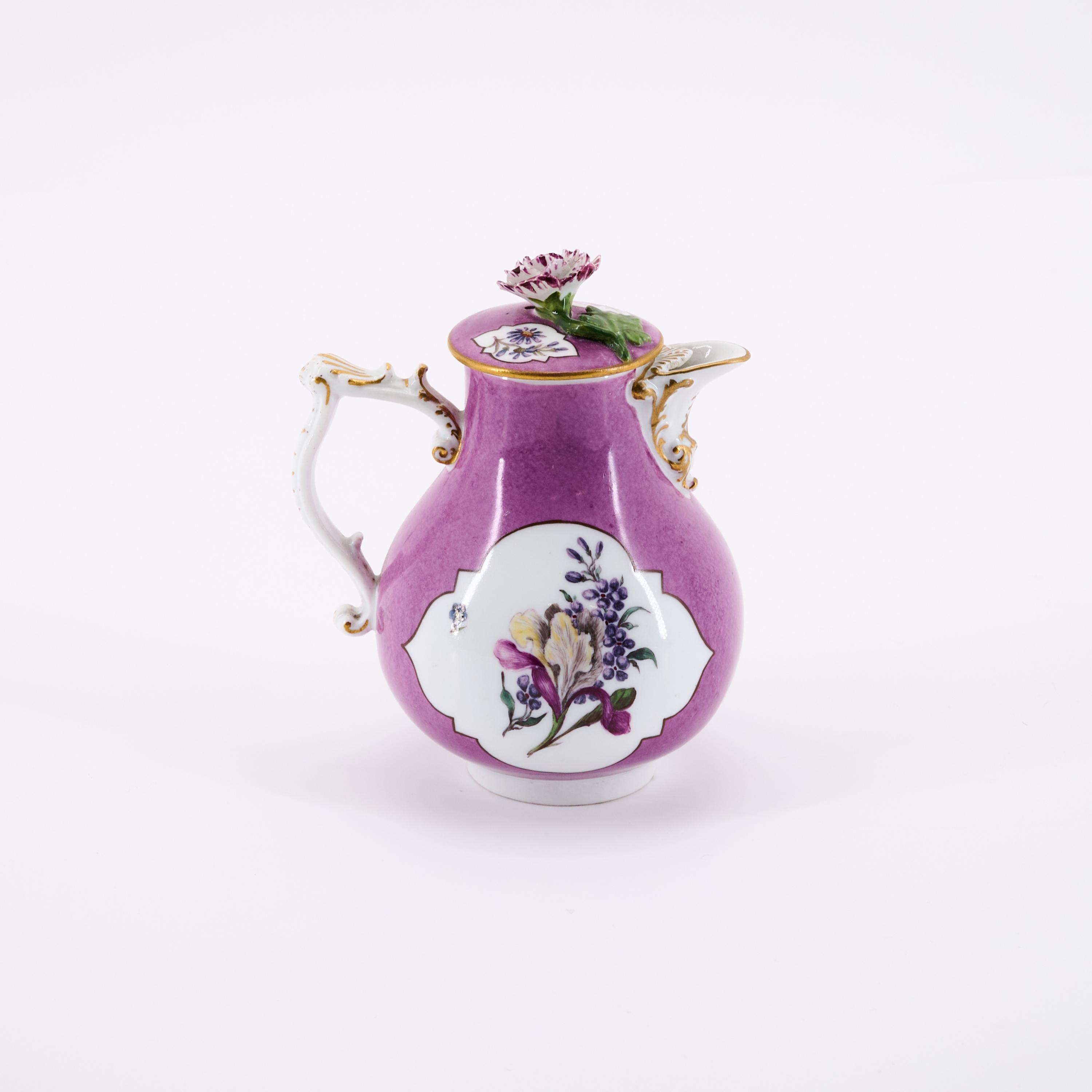 Technik: Porzellan, purpurfarbener Fond, polychrom und gold staffiert.
