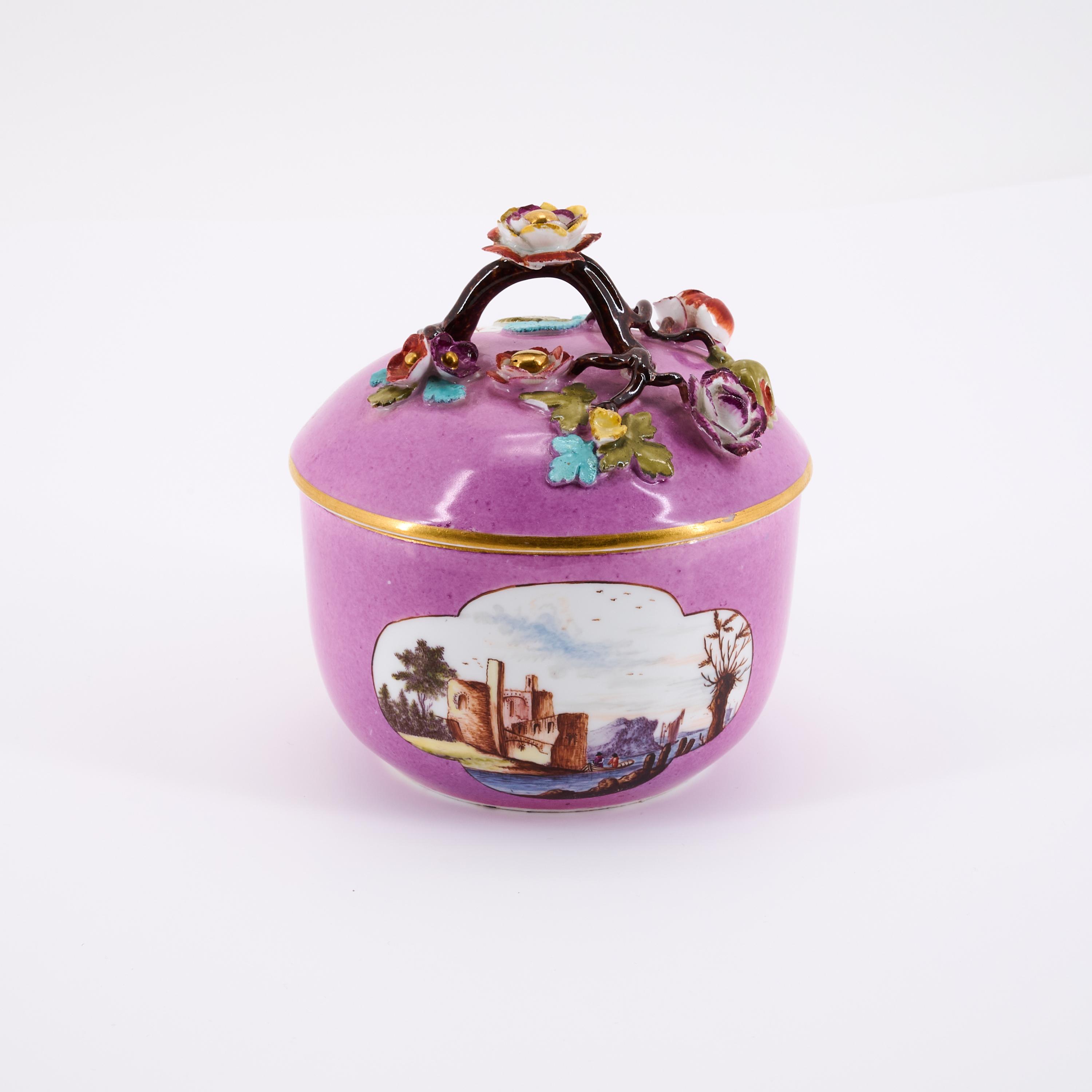 PURPURFOND ZUCKERDOSE MIT KAUFFAHRTEISZENEN.