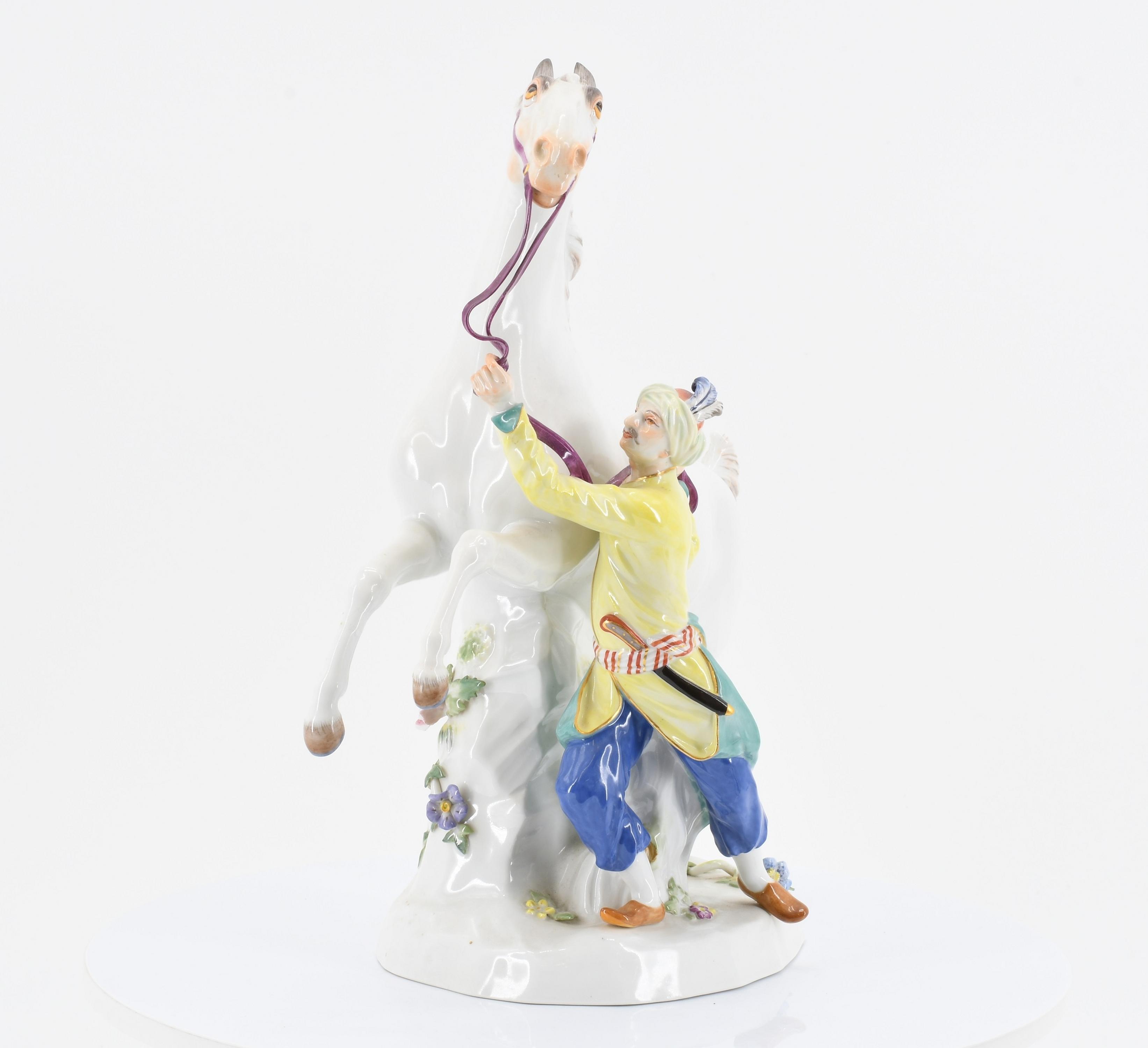 Beschreibung: Auf einem blütenbelegten Sockel stehender Orientale, einen steigenden Schimmel am Zügel
