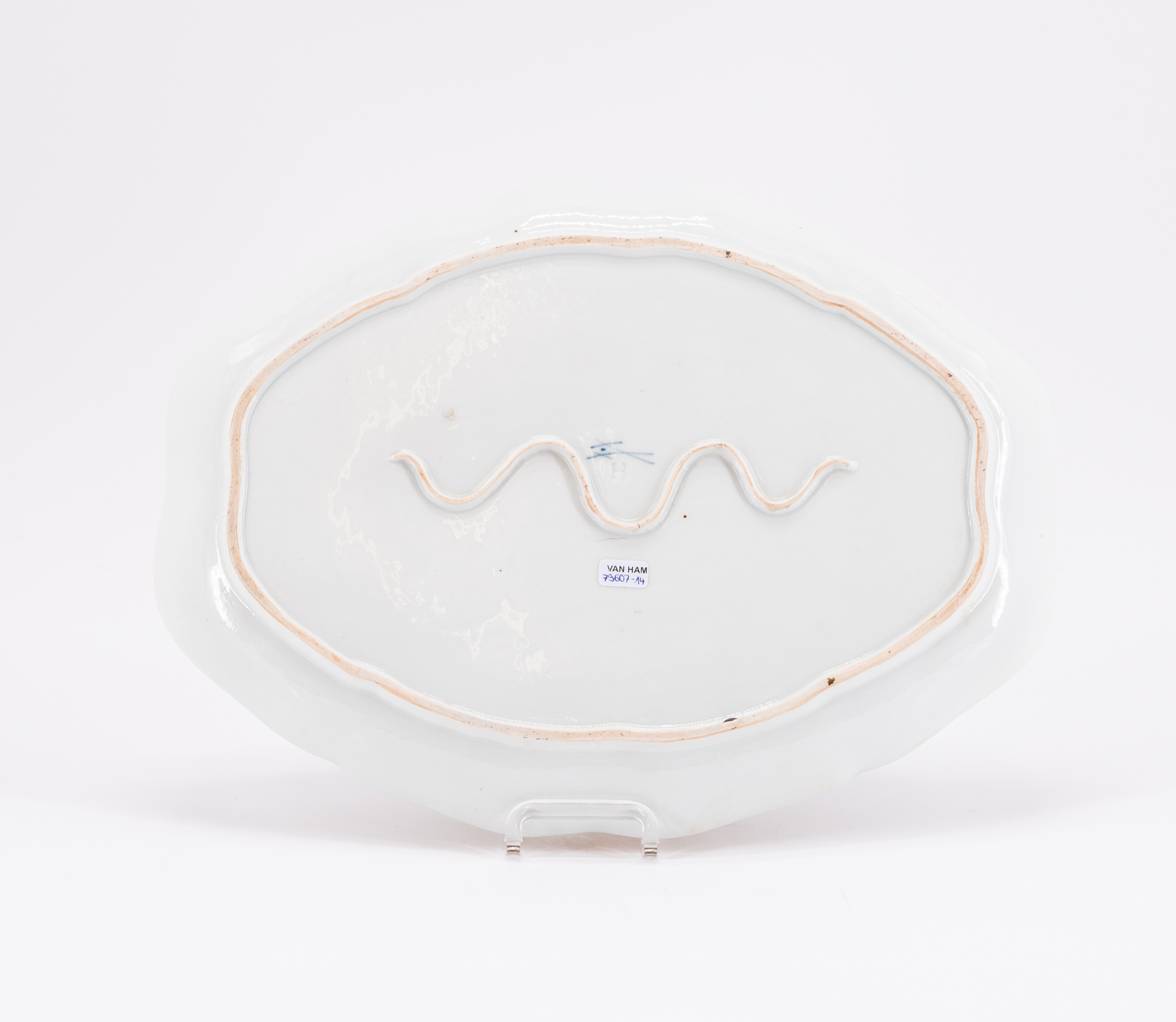 Marke: Schwertermarke mit Punkt, Unterglasurblau. Presszeichen 'H'.