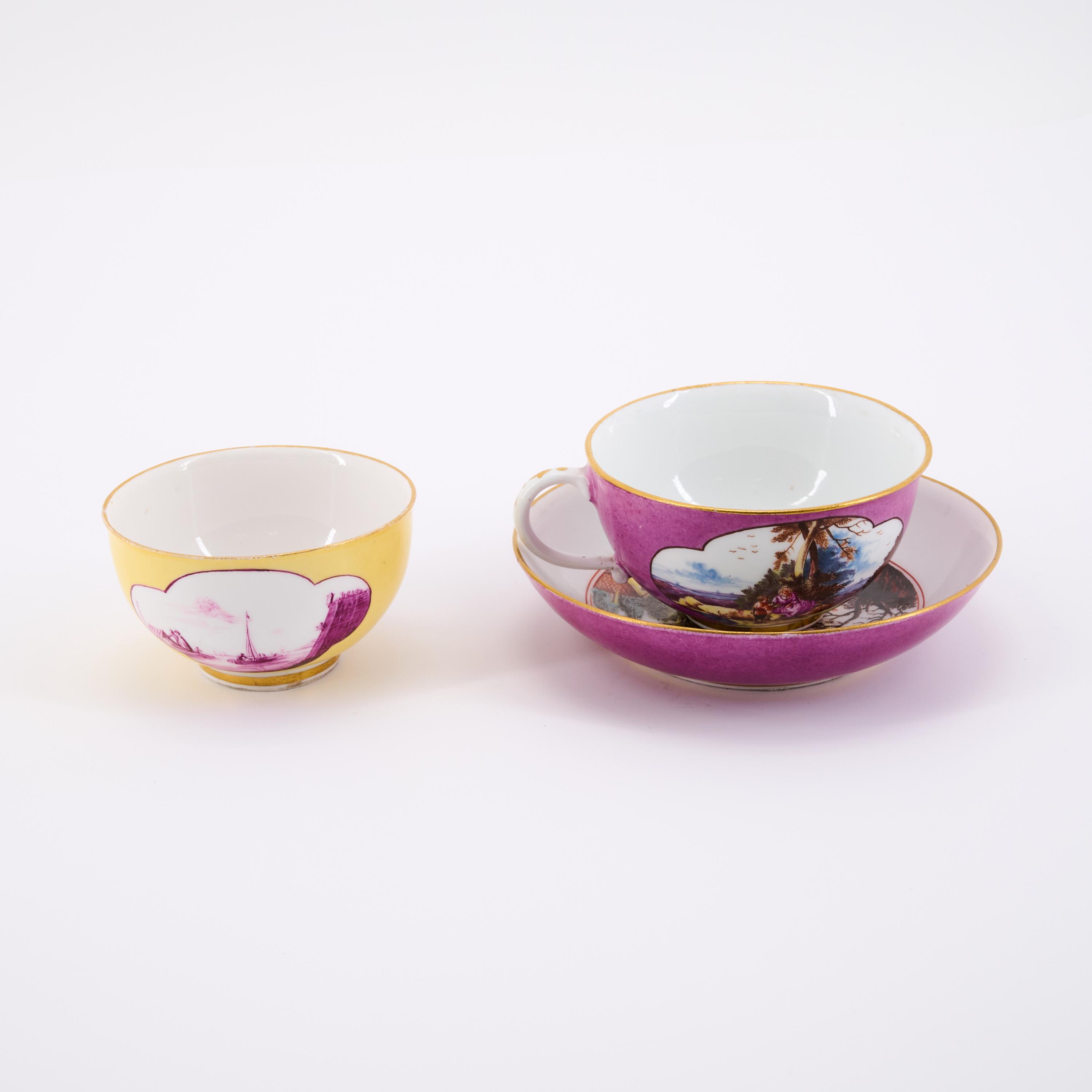 Technik: Porzellan, Purpur- bzw. Gelbfond, polychrom und gold staffiert, Camaieumalerei in Purpur.